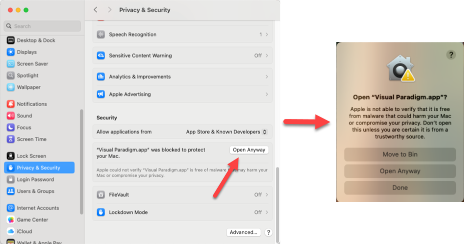 Before Apple completes the inspection user can go to Settings of your Mac, select Privacy & Security press Run Anyway under Security to launch Visual Paradigm.app, and then confirm Run Anyway again. After that Visual Paradigm application will be able to launch.